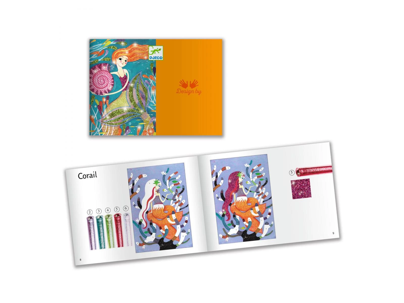 4 tableaux mettant en scène de charmantes sirènes à illuminer de paillettes colorées. L’enfant place son tableau dans la boîte, il dévoile les zones préencollées grâce à l’outil fourni, puis les saupoudre de poudre pailletée en suivant le code couleur indiqué dans le livret. Une fois l’activité terminée, ces merveilleuses sirènes scintillent et enchantent les enfants !