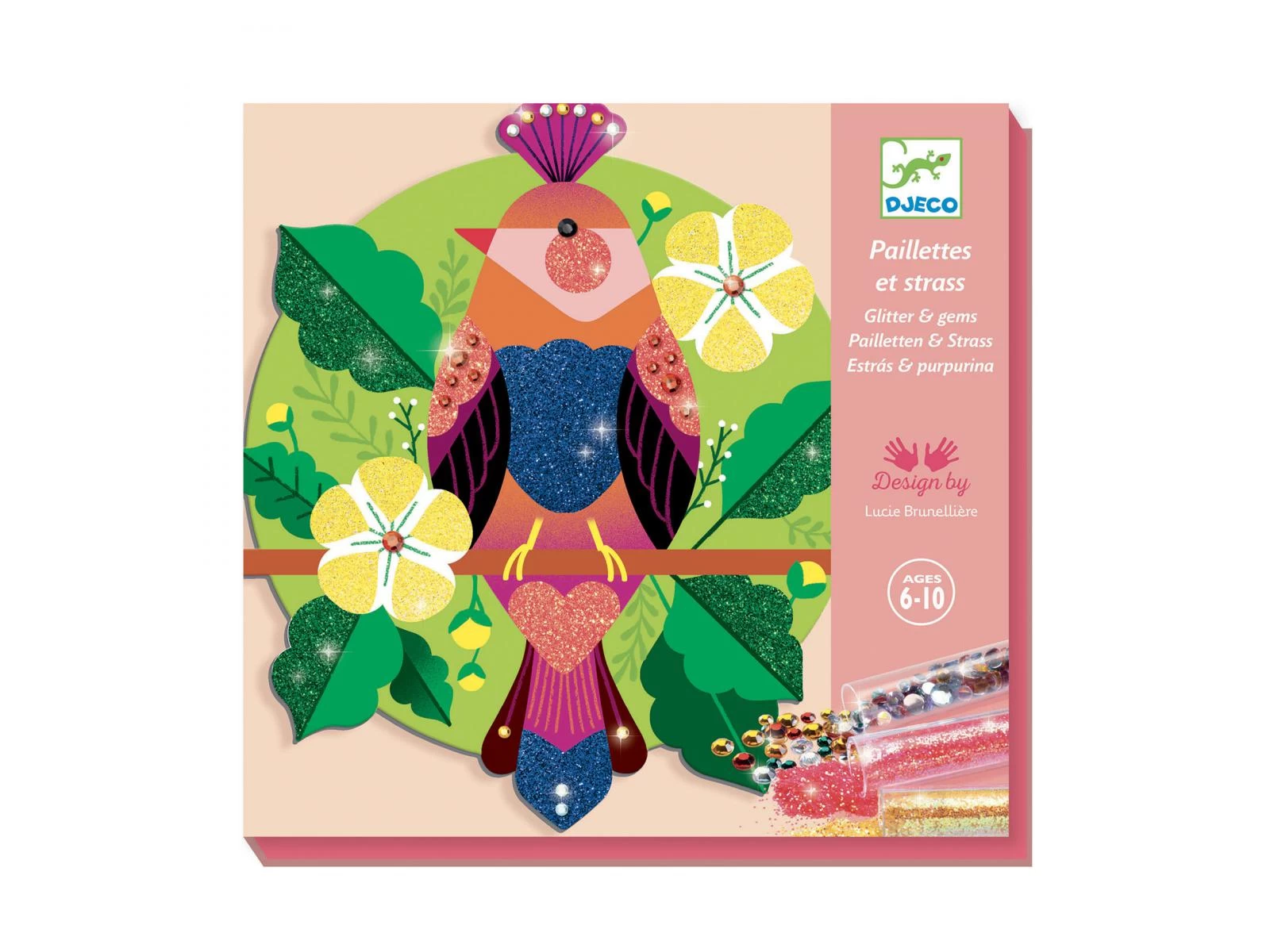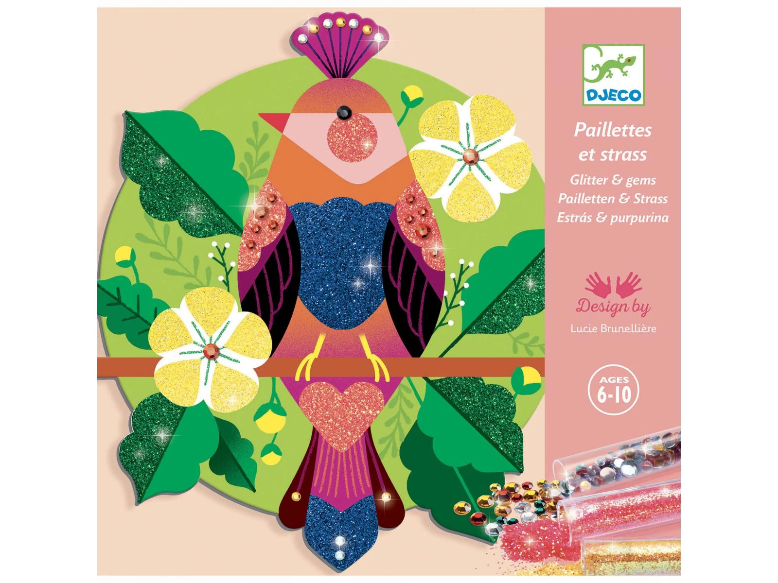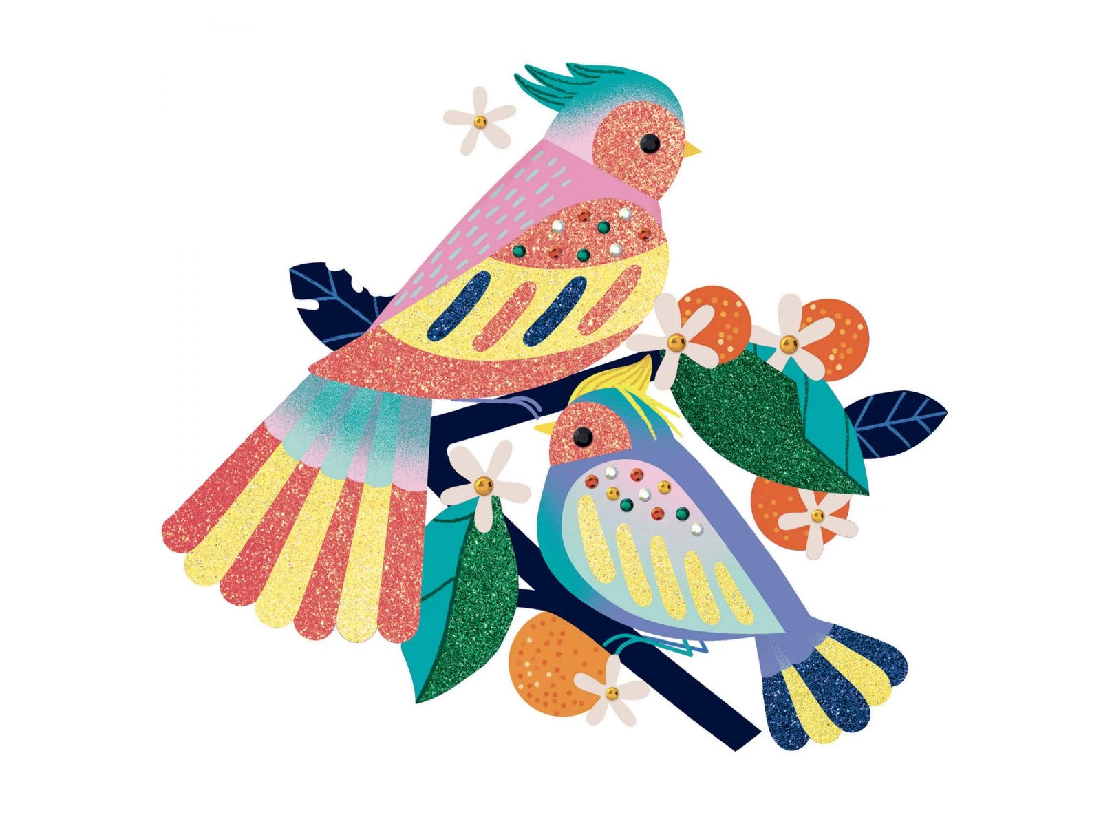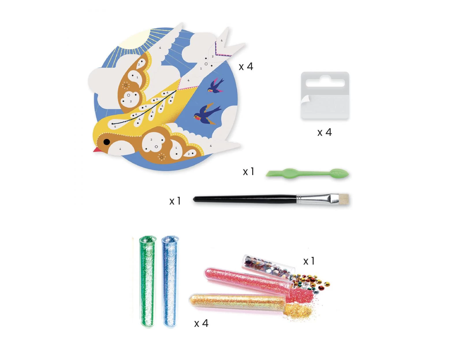 4 tableaux silhouettés en forme de médaillons à illuminer de paillettes et de petits strass. L’enfant place son tableau dans la boîte, dévoile les zones préencollées puis il positionne les strass et saupoudre la poudre pailletée en suivant le code couleurs indiqué dans le livret. Pour exposer ses réalisations, l’enfant fixe les petits crochets de suspension prévus à cet effet au dos des planches. Quelle fierté d’admirer les plumages chamarrés !