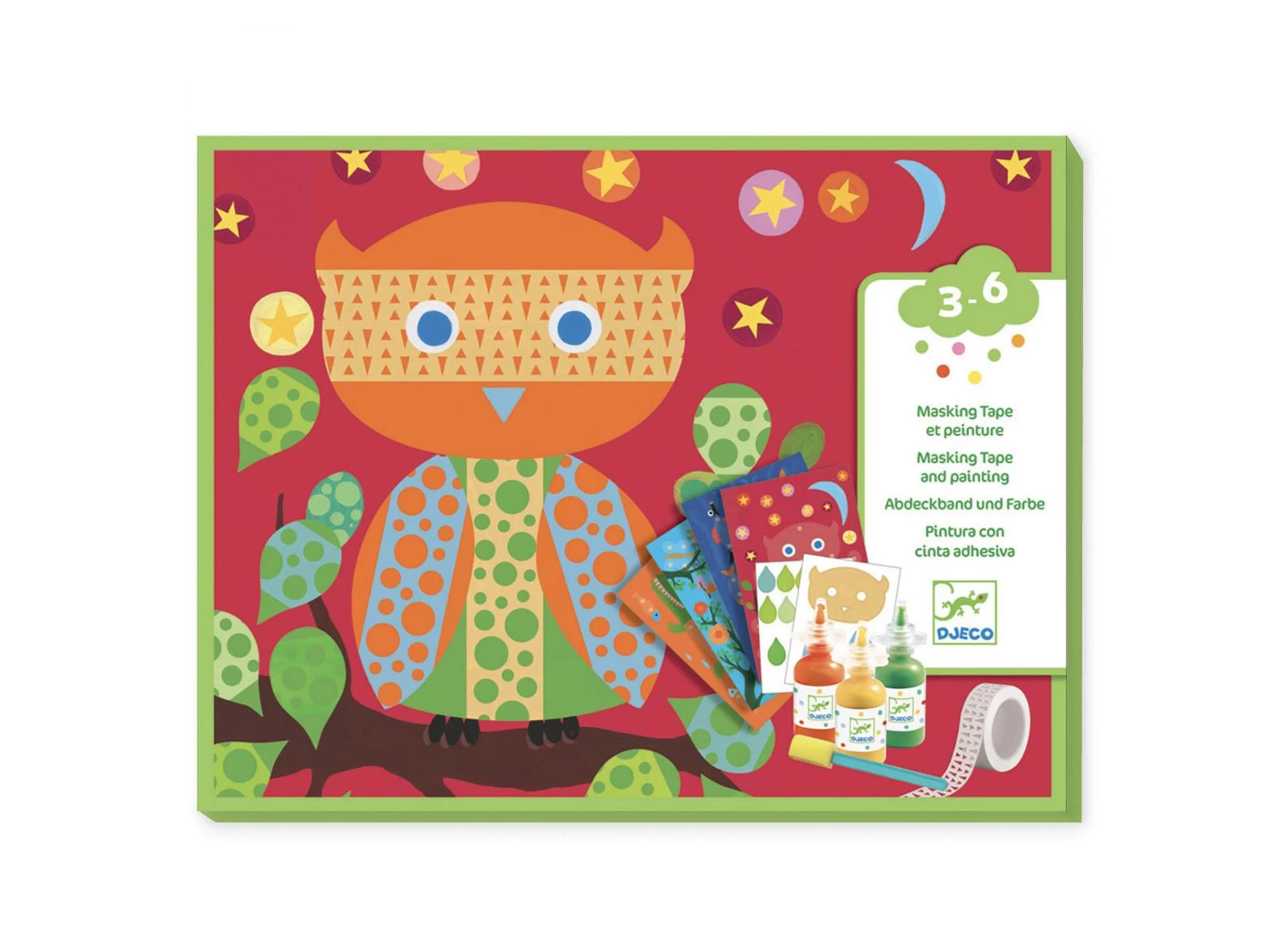 Un grand coffret de peinture sur le thème des animaux. Après avoir protégé la table avec la nappe, l’enfant colle le masking-tape dentelé sur les grandes cartes illustrées puis peint par dessus. Une fois la peinture sèche, il retire le masking-tape et découvre de jolis motifs. Magique !